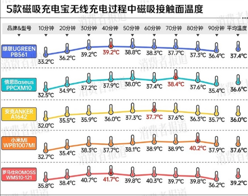 除了这次被曝光的20000毫安充电宝,罗马仕其他充电宝产品也曾在测评中被“亮红牌”。今年5月中旬,有媒体对5款热销磁吸充电宝的工作温度进行了测试,分别用5款磁吸充电宝对同一台手机进行无线充电,并记录下充电宝磁吸接触面、手机背面在9个时间点的温度,并取平均值,以评估磁吸充电宝自身、手机在无线充电时的发热情况。