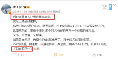 “别碰罗马仕”,在社交平台上,有数码博主早在2019年就谈及:“早期一些30-50元的1万毫安时的罗某某充电宝,阻燃塑料不达标,热控制不做,线材过于细软,接口部分的焊接也不太稳定,”“罗某某的低端充电宝,的确存在比较高的安全隐患”。